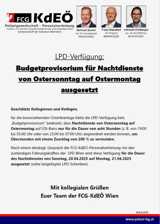 LPD-Verfügung betr. Budgetprovisorium für Nachtdienste von Ostersonntag auf Ostermontag ausgesetzt